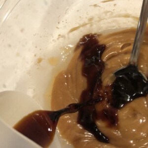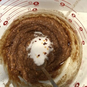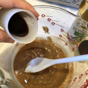 Next add the soy sauce or coconut aminos and rice vinegar, stirring well after each addition. I then add the sugar or maple syrup. At this point the water in the vinegar and the soy sauce may have caused the sauce to become less creamy and stiffer. Don’t worry.