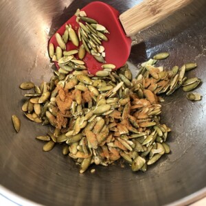 - Pour pumpkin seed mixture onto lined baking sheet. Use a spatula to scrape out all syrup and spices.