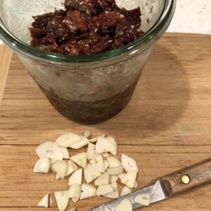 While the tomatoes are soaking, peel and slice the garlic. Remember to let your garlic sit about 10 minutes after slicing and before adding to the tomatoes to allow the allicin to develop (listen to episode 003 for more on allicin).