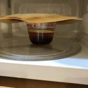 Put the maple syrup, oil and water in a glass measuring cup. Microwave until steaming.