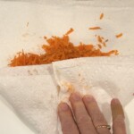 - Place the shredded vegetables on two strong paper towels. Wrap the vegetables and let the moisture drain out while you prepare the other ingredients.